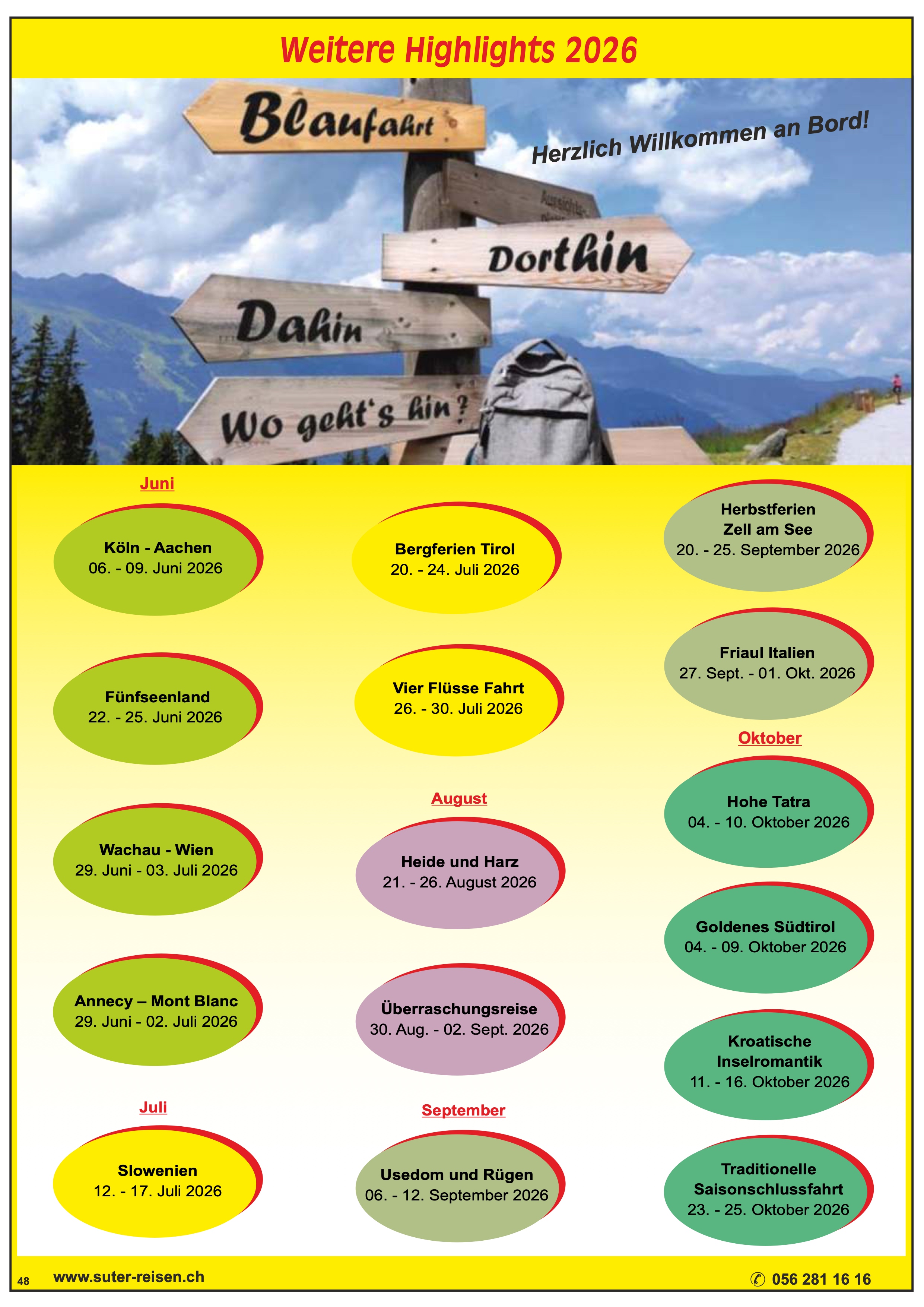 Ob nah oder fern – vertrauen Sie auf unsere Erfahrung, die sorgfältige Planung und persönliche Betreuung, ob im Büro oder unterwegs durch unsere erfahrenen Carchauffeure/Reiseleiter. Auch auf die gewohnten Leistungen wie unsere Frühbucherrabatte, Buchungen ohne Buchungsgebühren, reservierte Sitzplätze und Gratisparkplatz im Terminal Würenlingen müssen Sie nicht verzichten. Gerne stehen wir Ihnen unter Telefon 056 281 16 16 zur Verfügung oder benutzen Sie unser Buchungsformular.